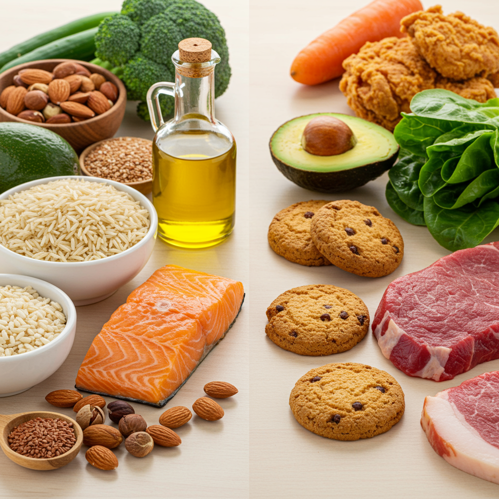 - 포화지방 및 트랜스지방 섭취 최소화: 붉은 육류의 기름진 부위, 가공식품(과자, 빵, 튀김류), 버터, 치즈 등에는 포화지방과 트랜스지방이 많습니다. 이들은 LDL 콜레스테롤 수치를 직접적으로 높이는 주범이므로 섭취를 최대한 줄여야 합니다.