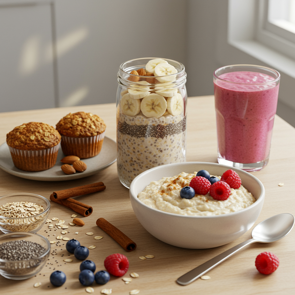 - 든든하고 간편한 귀리 오트밀: 물이나 저지방 우유에 귀리를 넣고 끓여 오트밀을 만드세요. 여기에 신선한 베리류 과일, 견과류 한 줌, 치아씨드 등을 토핑하면 영양 만점 아침 식사가 완성됩니다. 전날 밤 미리 불려두는 '오버나이트 오트밀'은 아침 시간을 더욱 절약해줍니다.
