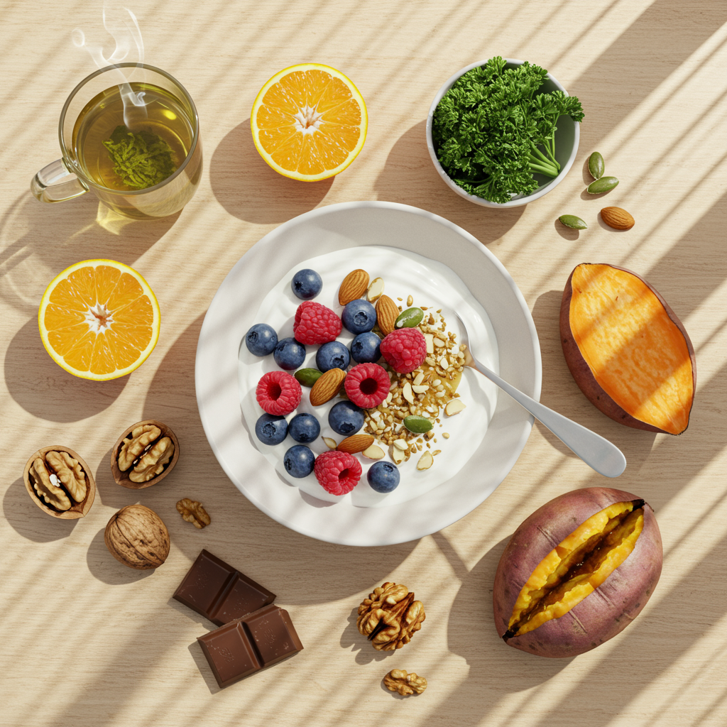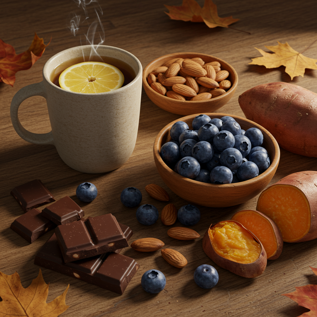 따뜻한 차 한 잔도 환절기 면역력 증진에 큰 도움이 돼요. 특히 녹차는 카테킨이라는 강력한 항산화 성분을 함유하고 있어 면역력 강화에 좋고, 따뜻한 꿀 레몬차는 비타민 C와 꿀의 항균 작용으로 감기 예방에도 탁월하답니다. 이 외에도 베타카로틴이 풍부한 고구마나 폴리페놀이 가득한 다크 초콜릿(카카오 함량 70% 이상)도 면역력 증진에 좋은 간식이 될 수 있어요.