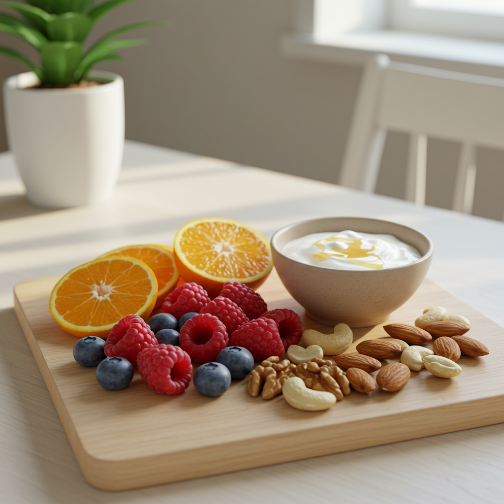 다이어트 중에도 과일의 당분이나 견과류의 칼로리는 무시할 수 없어요. 과일은 하루 권장량을 지키고, 견과류는 한 줌(약 20~30g) 정도만 섭취하는 것이 좋습니다. 무가당 요거트도 첨가물 없는 순수한 제품을 선택하세요!