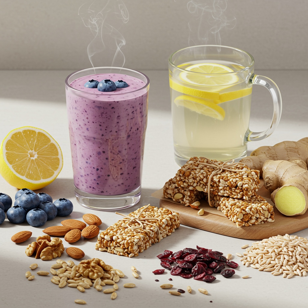 - 재료: 따뜻한 물 1컵, 레몬 1/4개 (즙), 생강 1조각 (얇게 저민 것), 꿀 약간 (선택)