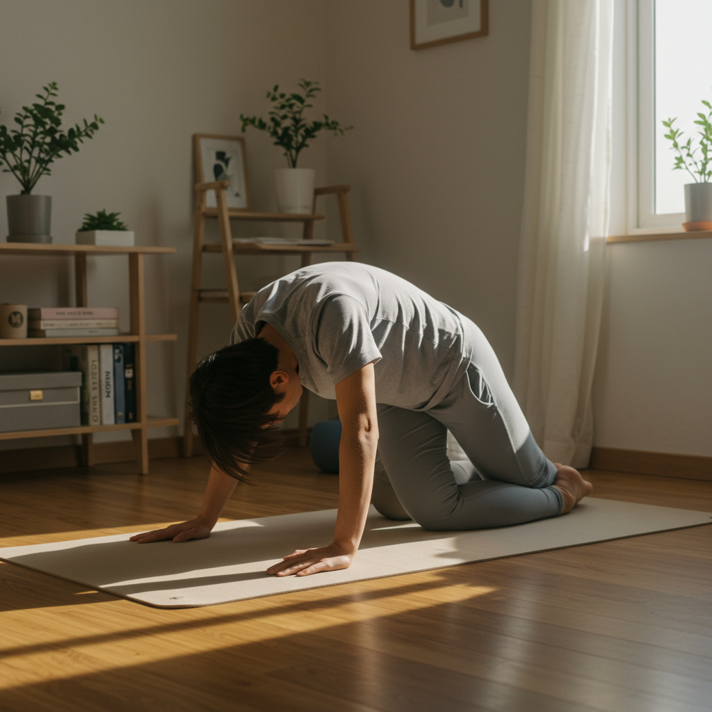 - 골반 안정화: 바닥에 앉아 무릎을 세우고, 허리 아래에 미니볼을 받칩니다. 복부를 납작하게 만들며 척추를 하나씩 바닥에 내려놓는 롤 다운 동작을 하면 골반과 코어 안정화에 큰 도움이 됩니다.